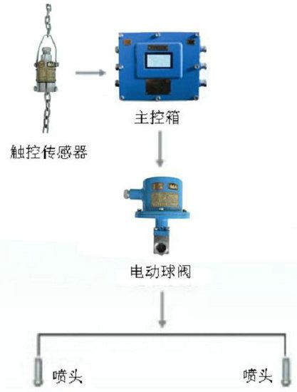 當(dāng)皮帶運(yùn)輸機(jī)輸煤時,煤流觸動傳感器探桿,觸控傳感器接收到信號觸發(fā)主控箱控制電路,打開電動球閥,裝置自動灑水降塵,無物料時延時一段時間后停止噴霧(延時可調(diào))。